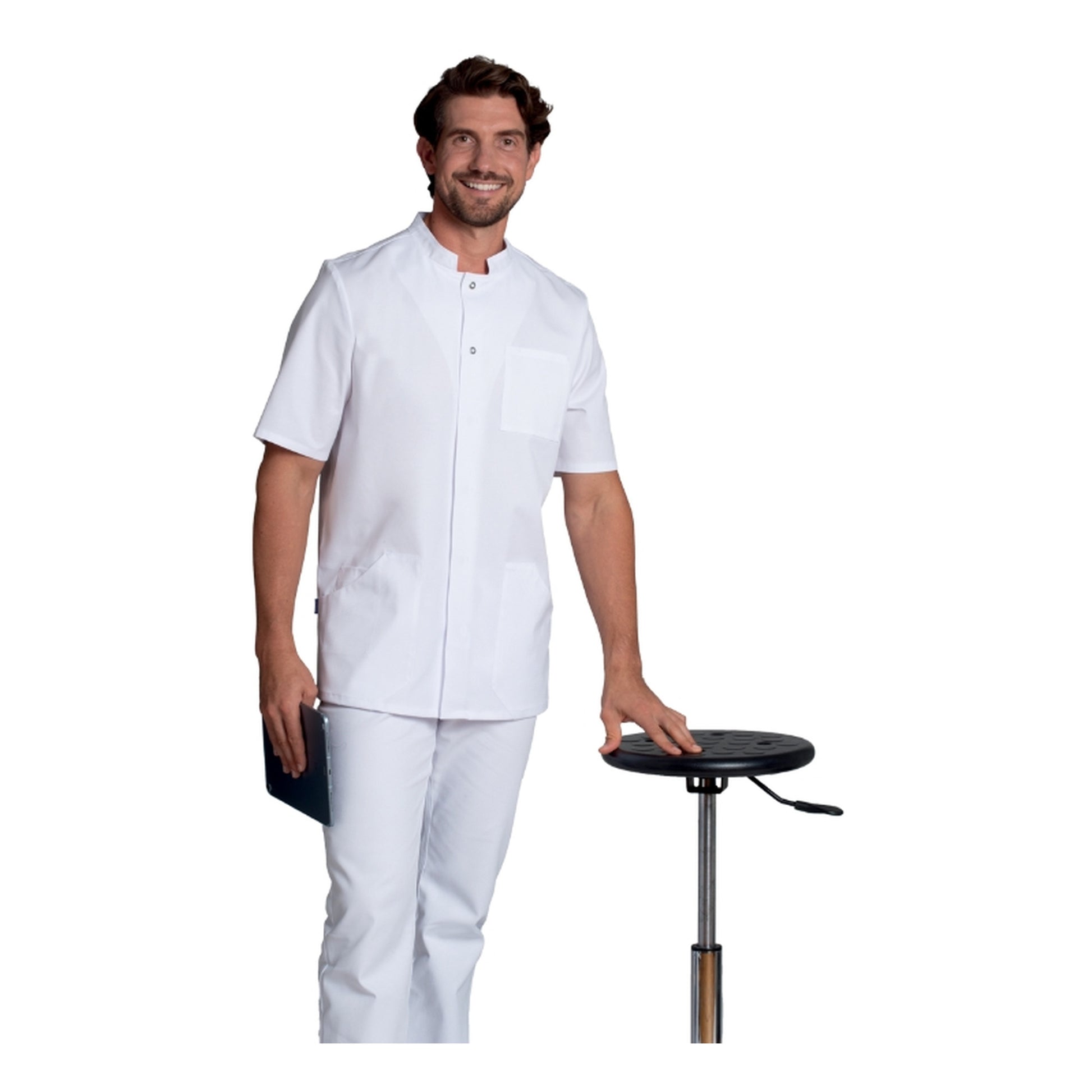 Dieser Herren-Kasack überzeugt durch sein klares, professionelles Design und hohe Funktionalität im medizinischen und pflegerischen Arbeitsalltag. Der moderne Stehkragen in Kombination mit der verdeckten Druckknopfleiste sorgt für eine gepflegte, sachliche Optik.
